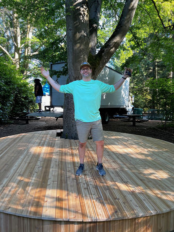 Client Request. Design and build a round cedar 18' diameter stage that goes around an existing tree. Design and build four event branded sasquatch characters with hole-in-face for a photo op. Winston and Maxine bar front rentals.